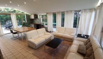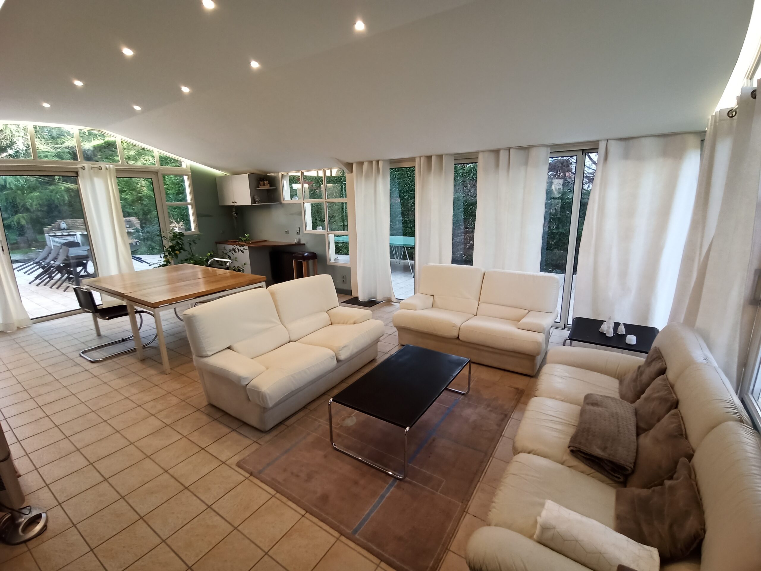 Une grande pièce de vie, baignée de lumière, dans un esprit véranda, offre un espace de vie supplémentaire de 40 m2.